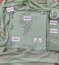 Front: Dyed chiffon front adorned with elegant embroidered neck patches and heavy adda hand embellishment for a rich, festive appeal.