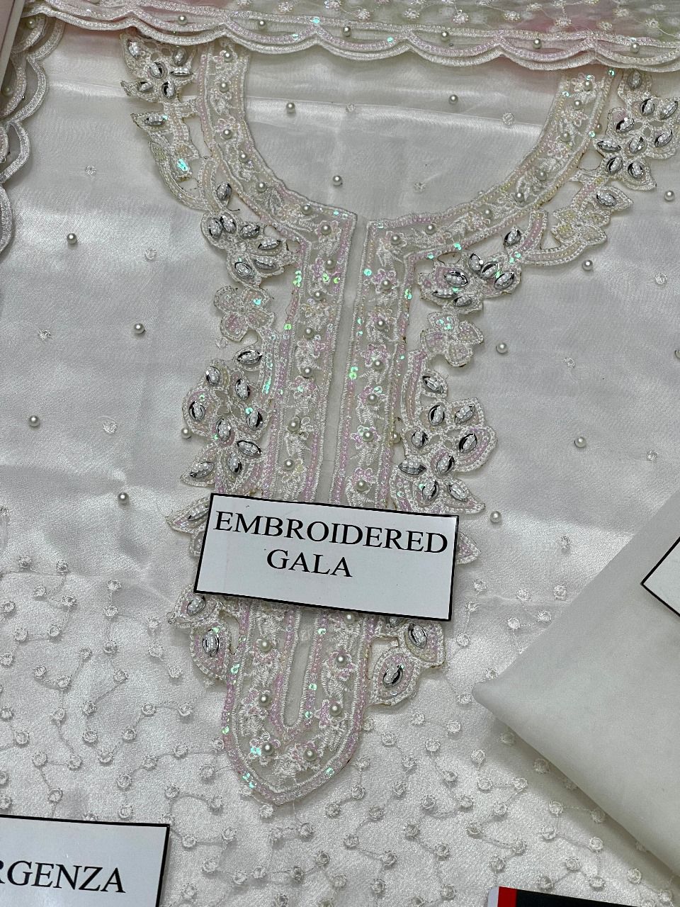 Dupatta: Heavy embroidered digital printed organza dupatta with elegant cutwork borders