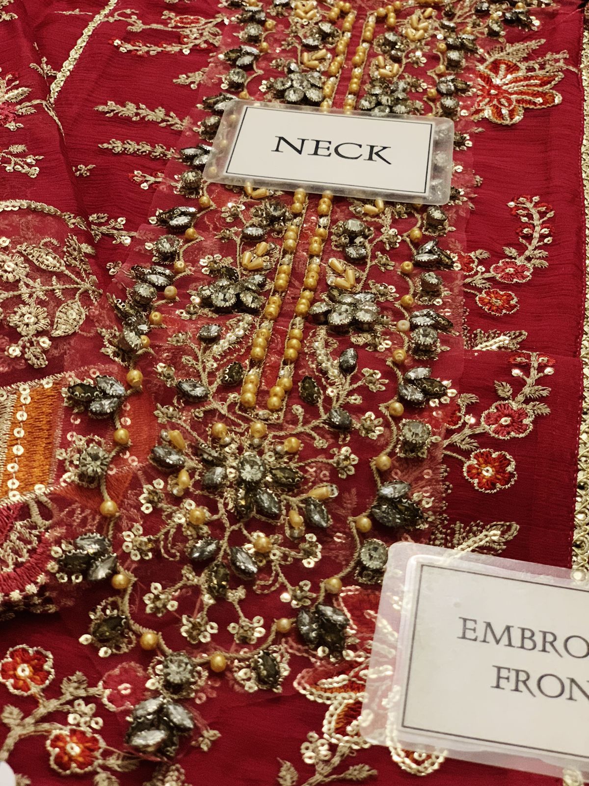 Sleeves: Chiffon fully embroidered with spangle work, finished with embroidered sleeve borders.