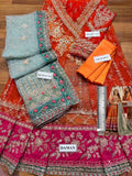 Dupatta: Net dupatta with 4-side embroidered border and 2-side heavy embroidered pallu