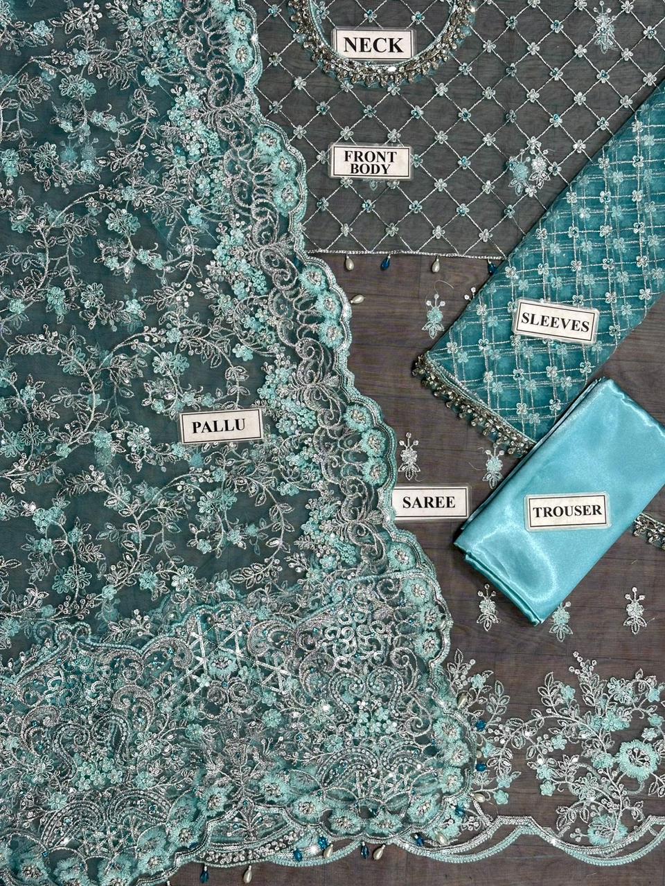 • Front & Back: Fully heavy embroidered net with cutwork borders, offering a graceful and high-end designer finish.
