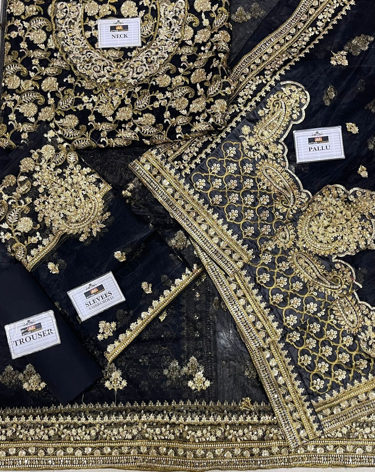 Front Body: Exquisite net fabric adorned with heavy embroidery, sequence detailing, and intricate hand stone work for a truly luxurious bridal look.