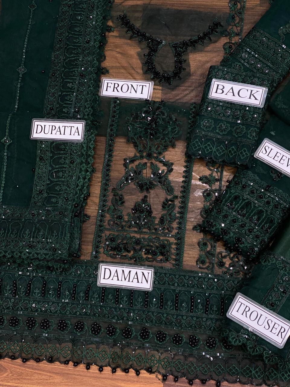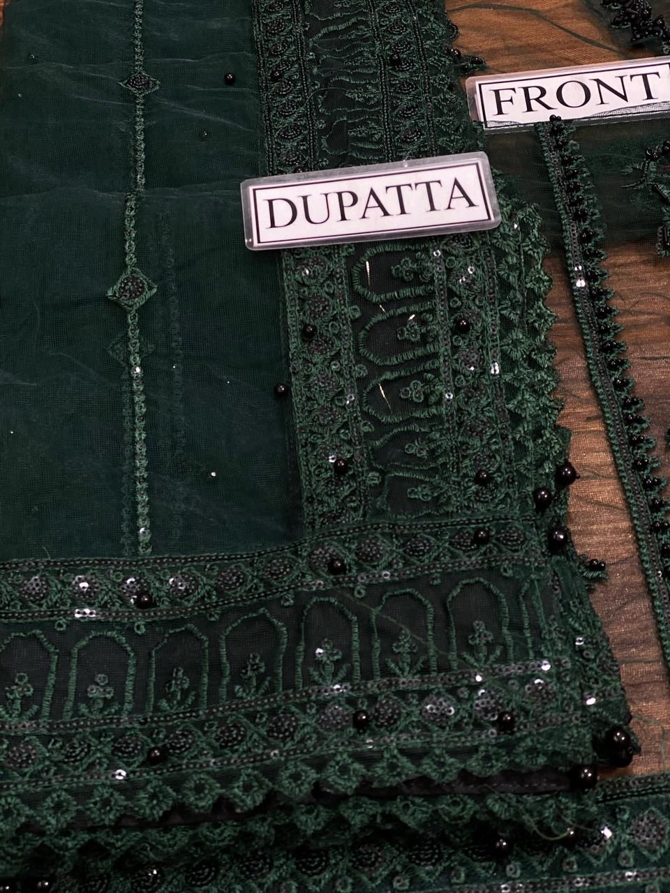 The back and sleeves continue the sophistication with detailed sequin embroidery and handcrafted adda work, ensuring every angle of this ensemble exudes elegance. Completing the look is a ready-to-wear net dupatta, beautifully embroidered with four-sided borders, paired with a silk trouser for a smooth and luxurious finish.